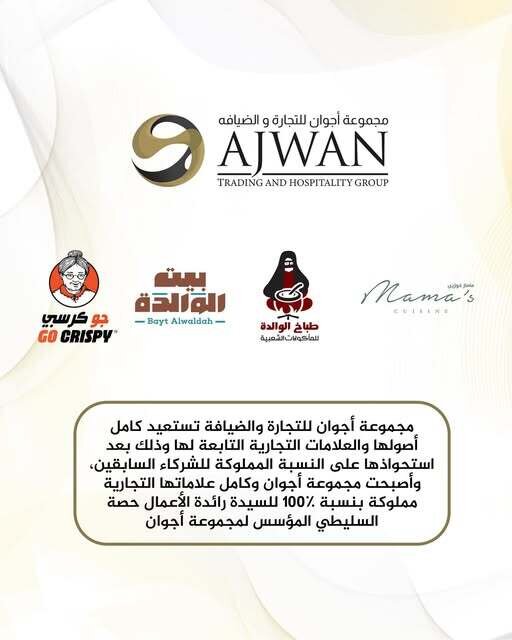 في خطوة استراتيجية تعكس رؤيتها الطموحة، أعلنت مجموعة أجوان للتجارة والضيافة – Ajwan Trading and Hospitality Group – عن استحواذها الكامل بنسبة 100% على جميع علاماتها التجارية، وفي مقدمتها "جو كرسبي – Go Crispy"، "بيت الوالدة – Bayt Al Walda"، و"ماماز كوزين – Mama’s Cuisine".